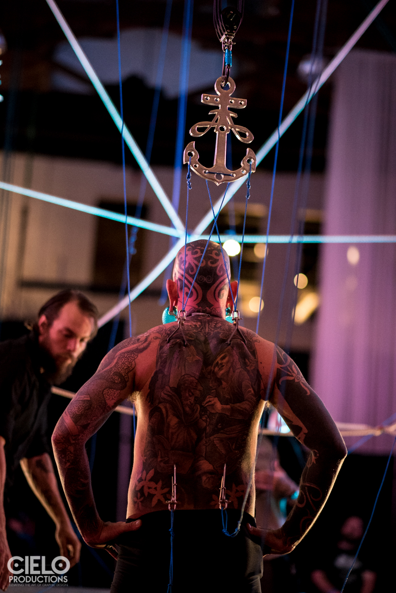Conceptually, a large structure tensioned into rigidity reflects some of the stress of societal connections and expectations external to our selves, and our shared experiences in that system are an integral part of our understanding where and who we are in the world. Two nights in a row, three different individuals within the Geode explored their shared interconnection of the suspension experience on a liminal level, and a tactile/physical one.